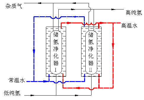 金屬氫化物儲氫凈化裝置通過以下過程實(shí)現(xiàn)了持續(xù)工作:(1)儲氫凈化器Ⅰ吸氫:將低純度氫通入儲氫凈化器Ⅰ,同時向水套中通入常溫水,使其開始吸氫。(2)儲氫凈化器Ⅰ放氫、儲氫凈化器Ⅱ吸氫:儲氫凈化器Ⅰ吸氫完成后,放出雜質(zhì)氣,然后向其水套中通入高溫水,儲氫凈化器Ⅰ開始放出高純氫氣;于此同時,將低純度氫通入儲氫凈化器Ⅱ,使其開始吸氫。(3)儲氫凈化器Ⅱ放氫、儲氫凈化器Ⅰ吸氫:儲氫凈化器Ⅰ放氫完全后,此時儲氫凈化器Ⅱ完成吸氫;向儲氫凈化器Ⅱ的水套中通入高溫水,使其開始放氫;同時將低純度氫通入儲氫凈化器Ⅰ,使其開始吸氫。如此通過兩個儲氫凈化器交叉進(jìn)行吸放氫,實(shí)現(xiàn)了連續(xù)凈化氫氣的操作。